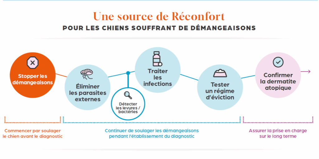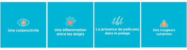 Des comportements inhabituels, comme se frotter les fesses ou la tête au sol, peuvent aussi trahir un inconfort cutané. Les premiers signes cliniques arrivent généralement entre les 3 mois et les 3 ans de l’animal mais sont variables selon les races de chiens et le stade de la maladie.