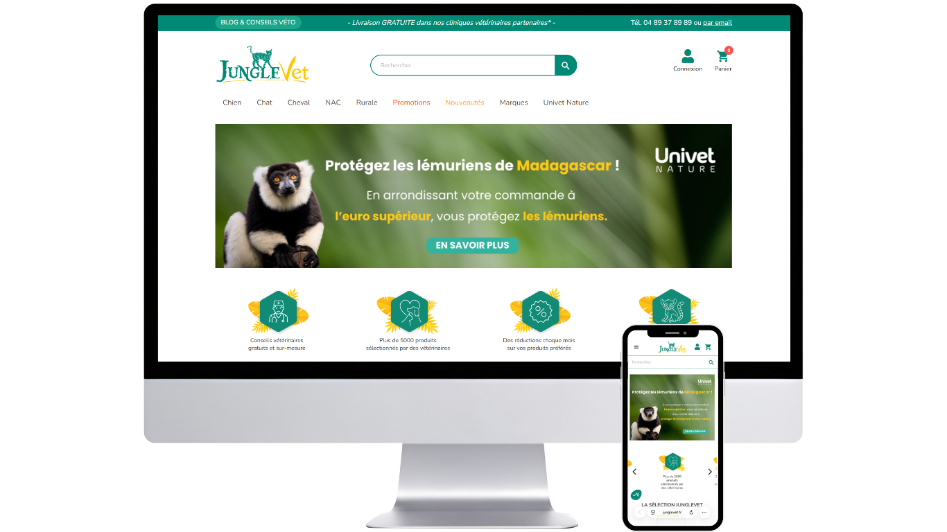 JungleVet met à disposition des propriétaires d’animaux de compagnie plus de 5000 références de qualité, sélectionnées par nos vétérinaires et proposées au meilleur prix. Les commandes sont disponibles gratuitement en click & collect dans les cliniques Univet.